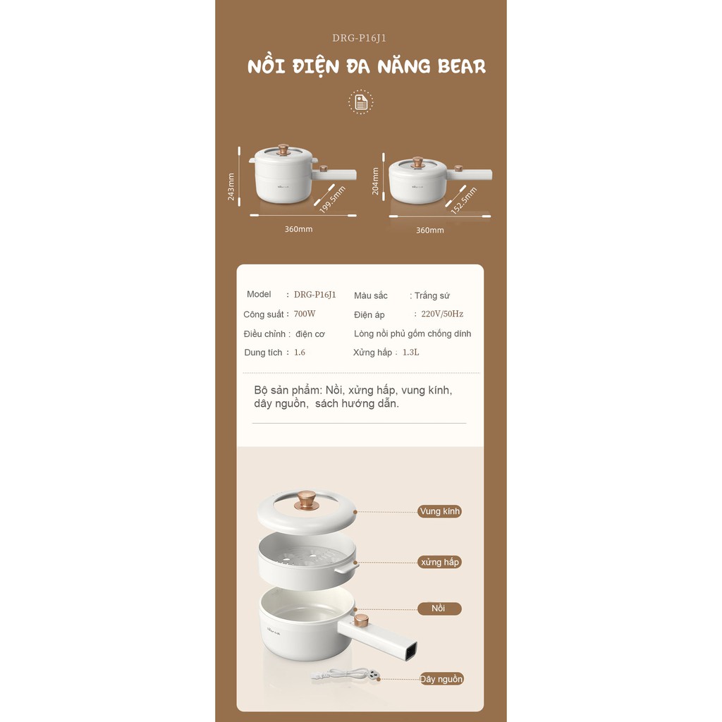 Giới thiệu [Mã ELHADEV giảm 4% đơn 300K] Nồi điện đa chức năng BEAR DRG-P16J1 chống dính gốm 1.6L (hàng nội địa)
