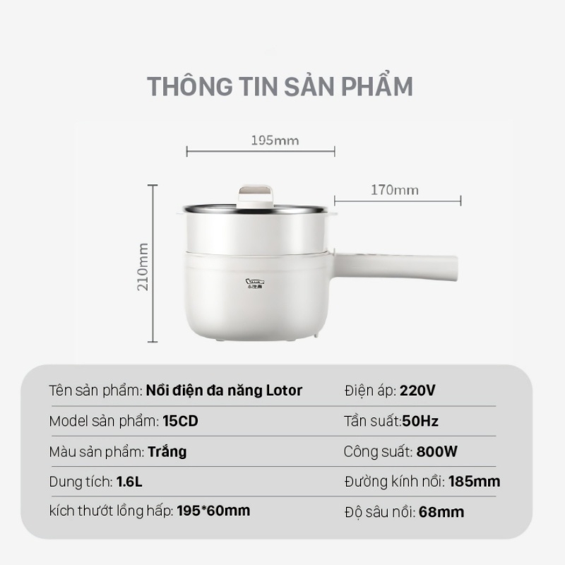 Nồi điện đa năng Chính hãng Lotor 15CD 1.6 Lít - Chiên, xào, nấu cơm, nhúng lẩu, nồi có lớp chống dính lồng hấp đa năngMô tả sản phẩm: