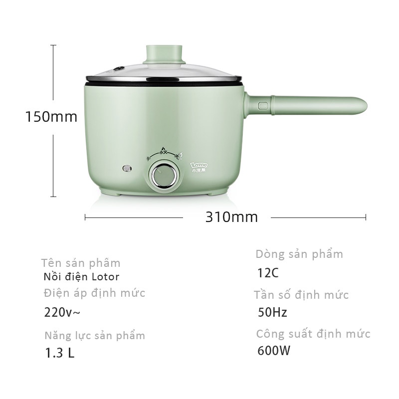 Nồi điện đa năng chống dính Lotor 1.3L - Nấu cơm, lẩu, hấp, luộc, chiên xào tiện lợi - Bảo hành 12 tháng
