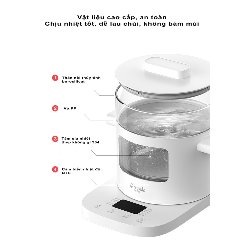 Nồi được trang bị kết cấu 2 lớp gồm lớp vỏ PP cách nhiệt bên ngoài và lớp trong là lòng nồi bằng thủy tinh borosilicat có thể chịu được nhiệt độ cao 170 °C và nhiệt độ thấp -10 °C. Đặc biệt, với thiết kế chia đôi của nồi thì phần thân nồi có thể được vệ sinh riêng vô cùng dễ dàng. Với đường kính 170mm, thiết kế thành bên trong nhẵn bóng, cùng chất liệu thủy tinh borosilicat sẽ giúp đơn giản hóa các thao tác vệ sinh bên trong nồi, không dễ bám mùi và rất dễ lau chùi bằng tay.
