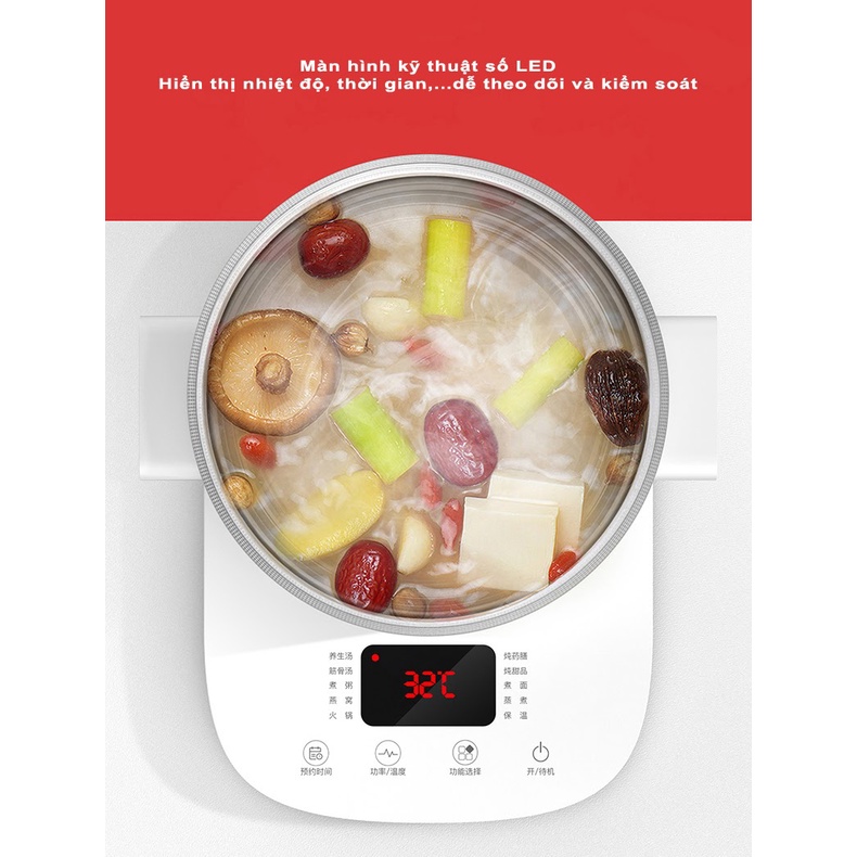 Chỉ với 1 chiếc nồi điện Deerma DG30 người dùng có thể linh hoạt chế biến đa dạng các món ăn khác nhau như hầm, luộc, hấp, nấu canh, nấu lẩu,...Menu công thức của từng món ăn đã được tích hợp sẵn và bạn chỉ cần chuẩn bị nguyên liệu và nhấn nút để nồi tự động thực hiện quá trình nấu. Từ đó vừa giúp tiết kiệm thời gian, công sức lại vừa giữ được độ tươi ngon và màu sắc tự nhiên của món ăn.
