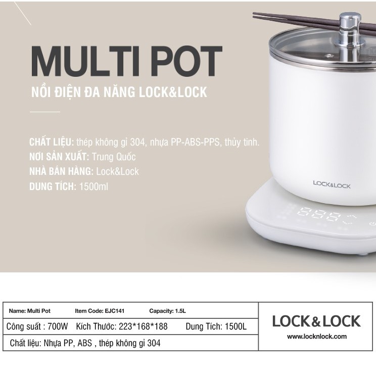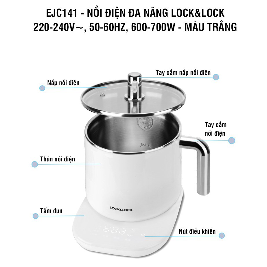 EJC141 - Nồi điện đa năng Lock&Lock, 220-240V~, 50-60Hz, 600-700W - màu trắngChất liệu: