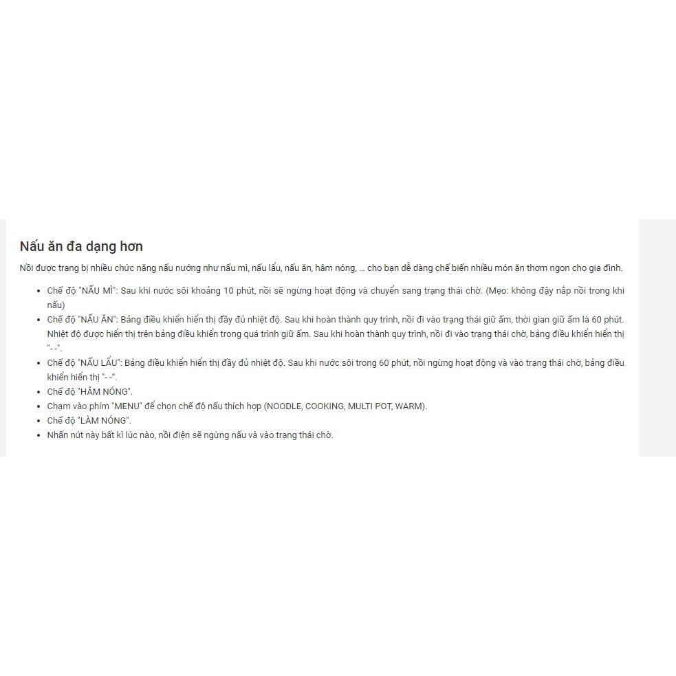 - Nồi điện có nhiều chức năng nấu, đáp ứng đủ nhu cầu nấu nướng trong gia đình hoặc khi du lịch.