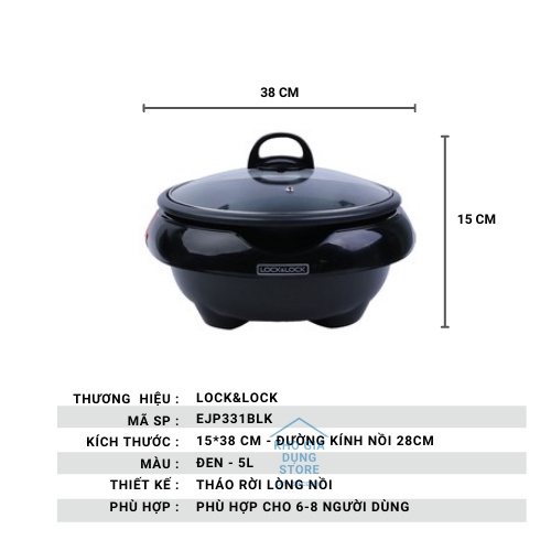 - Công suất mạnh, dung tích lớn: Nồi lẩu điện đa năng Lock&Lock EJP431SN có dung tích 5 lít, chứa được nhiều thức ăn, mâm nhiệt lớn có thể đặt được nhiệt độ từ 0 - 230 độ C cho bạn thời gian nấu nướng nhanh chóng, giúp tiết kiệm thời gian cho các bà nội trợ. 28cm đường kính