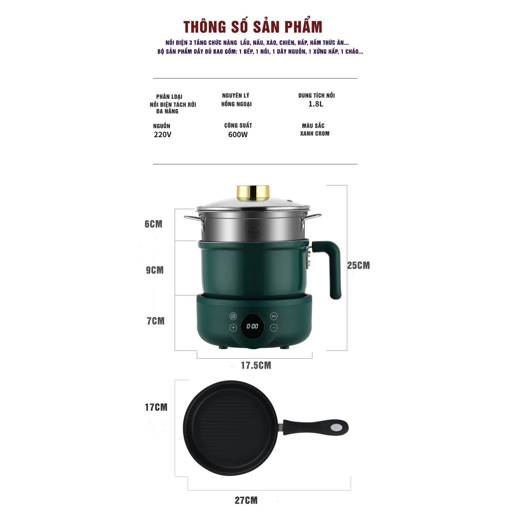 + Nồi 3 tầng bao gồm: 1 bếp, 1 nồi, 1 xửng hấp, 1 chảo, dây nguồn, sách hướng dẫn