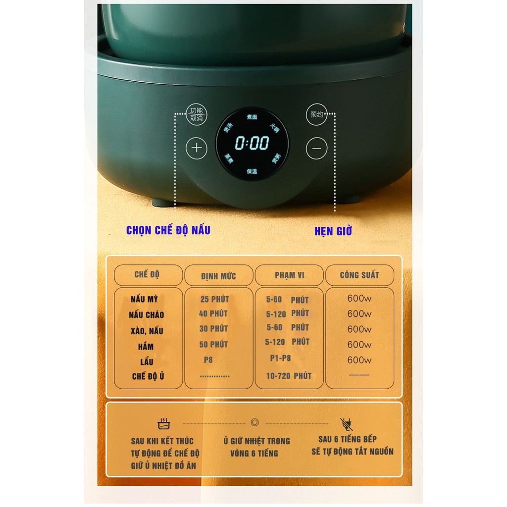 Đa chức năng nấu, chưng, chiên, hấp, hầm canh, nấu lẩu, mì Có thể điều chỉnh nhiệt độ và công suất nấu thích hợp với từng món ăn khác nhau