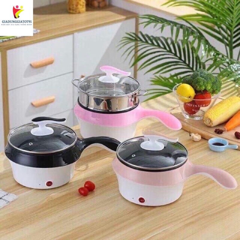 Nồi lẩu kèm hấp tay cầm size 18cm- Nồi điện dùng để nấu mì, nồi lẩu điện mini có 2 lớp: Lớp trong là inox, lớp ngoài là nhựa chống nóng dùng cá nhân 1-2 người, dùng để nấu canh, đun nước sôi, nấu mì, hấp đồ ăn...