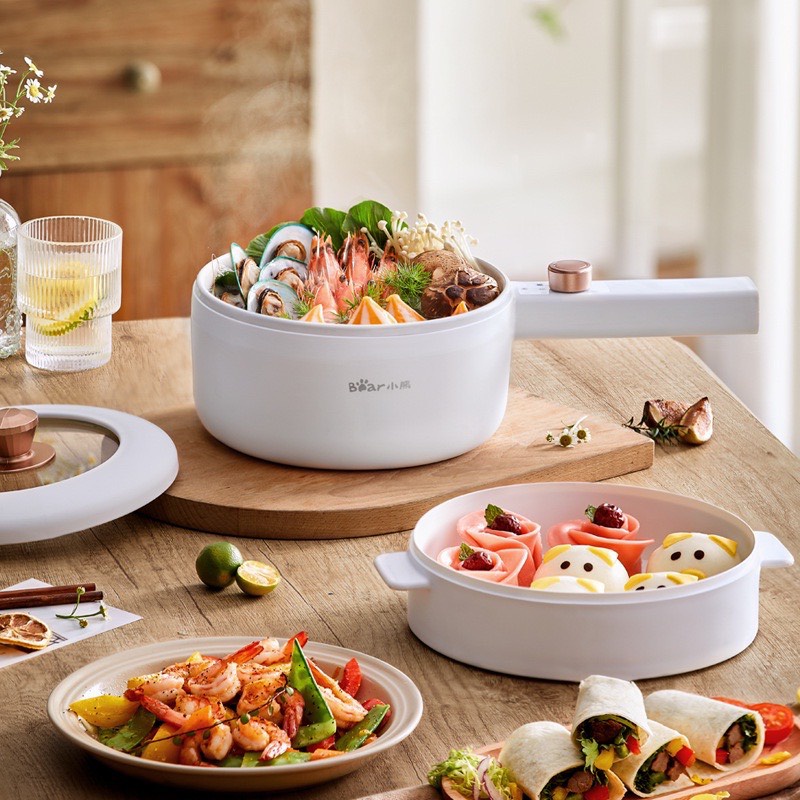 Nồi điện mini đa năng BEAR 2 tầng dùng để hấp, hầm cháo, nấu mỳ, lẩu, chiên rán - Công suất 600W