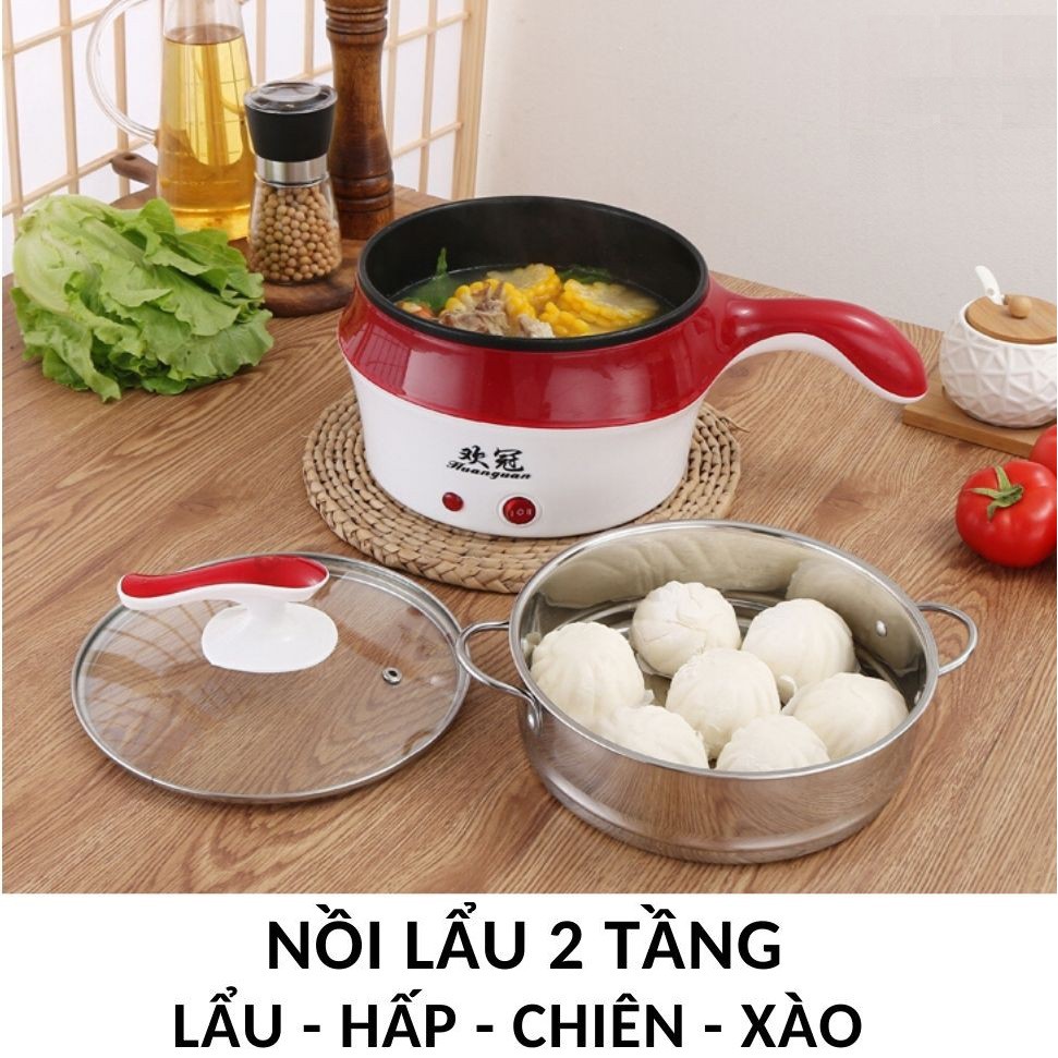Nồi Điện Mini Hai Tầng Đa Năng Kèm Khay Hấp - Ca Nấu Mì Mini Có Thể Chiên, Xào, Nấu Cơm, Nấu Lẩu