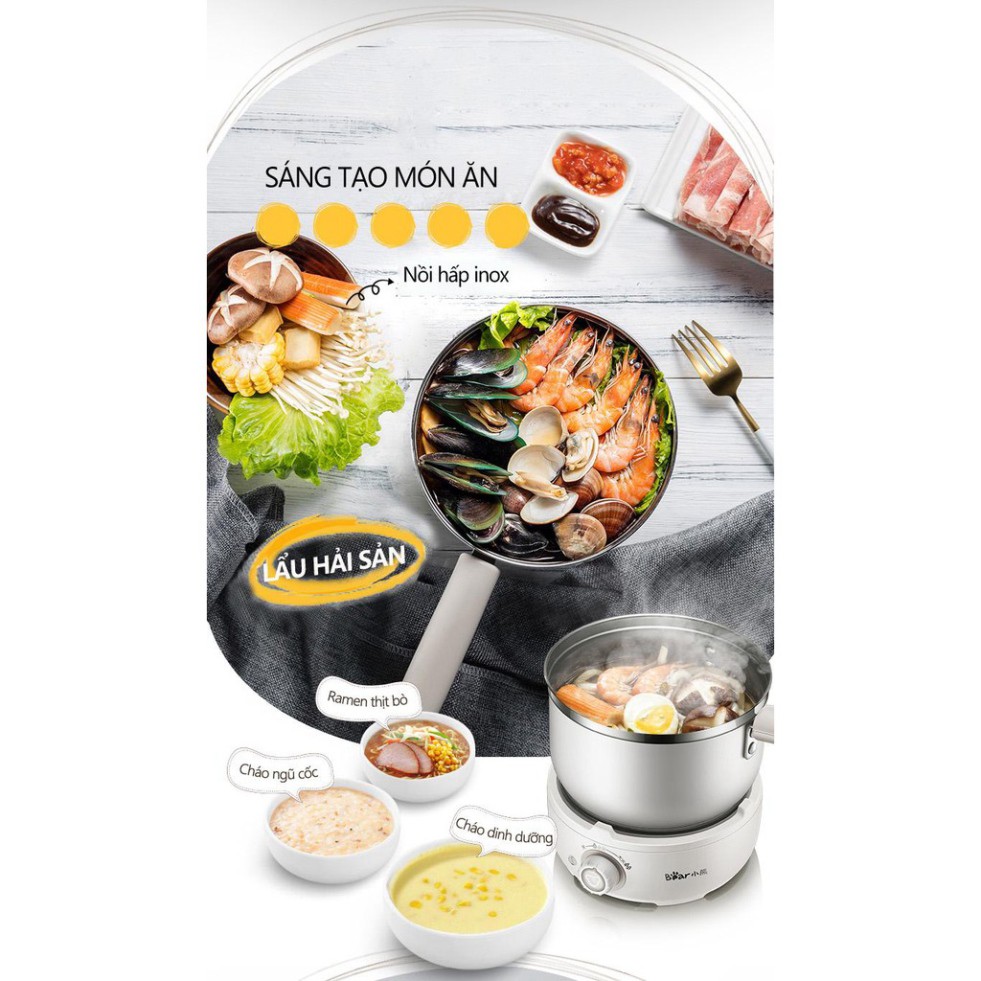 Nồi Lẩu Điện Đa Năng Bear DHG-B25V1 với bộ nồi nấu, xửng hấp, chảo chiên, giúp bạn chế biến được nhiều món ăn khác nhau, thích hợp cho gia đình ít người, mang đến cho bạn những bữa ăn thơm ngon, nóng hổi mà không mất quá nhiều thời gian, công sức chuẩn bị.Công suất 500W, truyền nhiệt đều, giúp cho việc nấu được nhanh chóng hơn