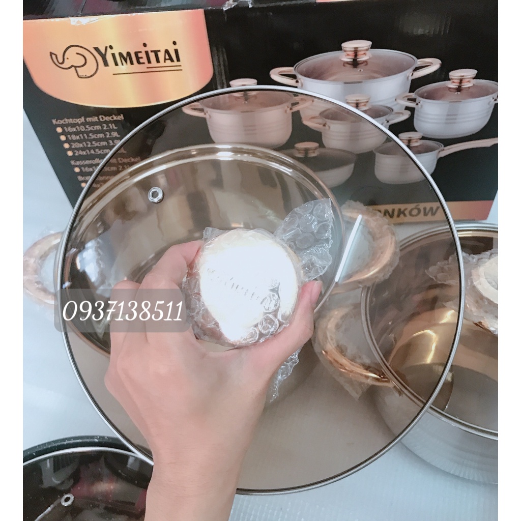 Bộ nồi Đức 5 đáy Yimeitai 6 món lắp hợp kim vàng - dùng cho mọi loại bếp điện, bếp từ, bếp ga- 1 Nồi to có nắp kính: đường kính 24 cm, dung tích 6.6 Lít, chiều cao 14,5cm.