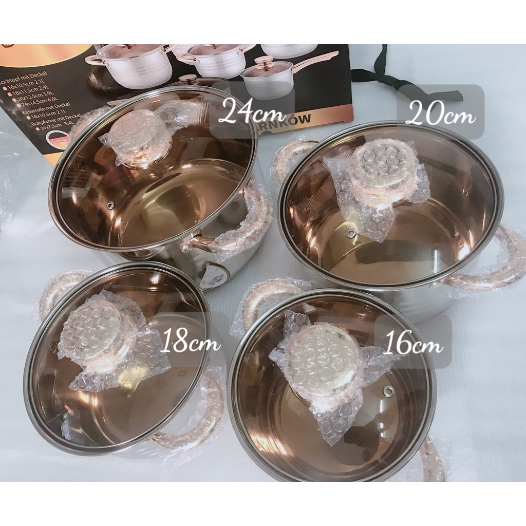Bộ nồi Đức 5 đáy Yimeitai 6 món lắp hợp kim vàng - dùng cho mọi loại bếp điện, bếp từ, bếp ga- 1 Nồi to có nắp kính: đường kính 24 cm, dung tích 6.6 Lít, chiều cao 14,5cm.