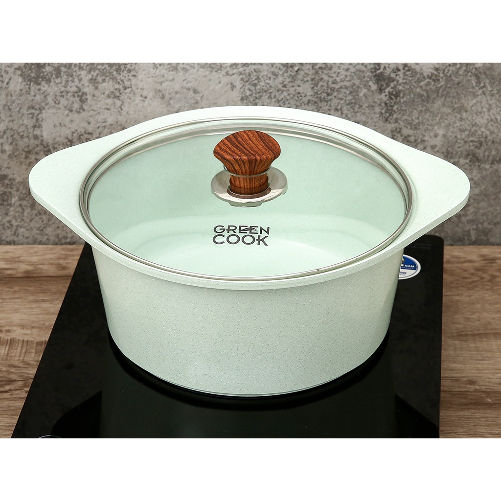 Nồi (quánh) đúc đáy từ men đá xanh ngọc Green Cook Gông nghệ Hàn Quốc được sản xuất theo công nghệ cao Hàn Quốc, phủ đá thiên nhiên siêu bền và thân thiện với môi trường. Phủ 5 lớp chống dính CERAMIC siêu bền, an toàn cho sức khỏe, dày 3mm, chịu lực tốt, chống biến dạng, chống dính tốt, dễ lau chùi.