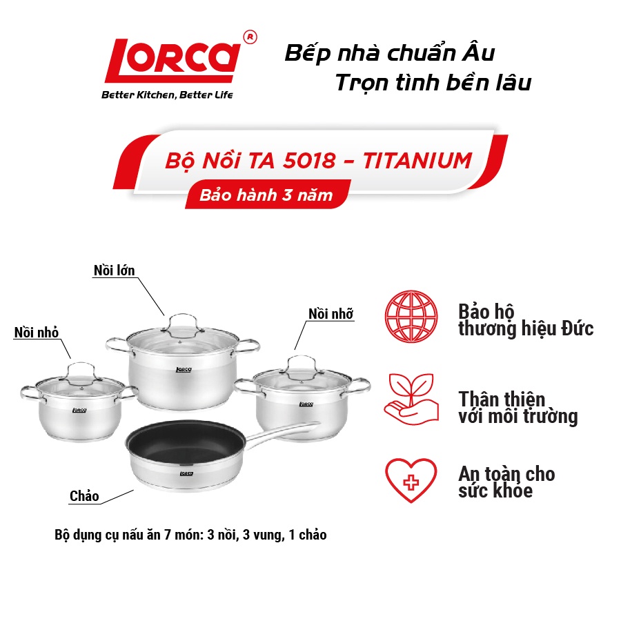 Nhà cửa & Đời sống > Dụng cụ nhà bếp > Nồi || Bộ nồi đun cao cấp Lorca Titanium TA 5018- Bảo hành 3 nămCòn hàng