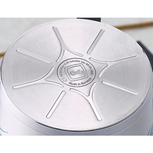 - Fissler sử dụng công nghệ đáy nồi Cookstar độc quyền, thiết kế 3 lớp dày dặn gồm: phần tiếp xúc với thức ăn bên trong là thép không gỉ 18/10 an toàn cho sức khỏe, ở giữa là phần đĩa nhôm 8mm giúp truyền dẫn nhiệt tốt nhất và lớp thép không gỉ 18/0 bên ngoài giúp nồi Fissler sử dụng tốt trên mọi loại bếp – kể cả bếp từ.