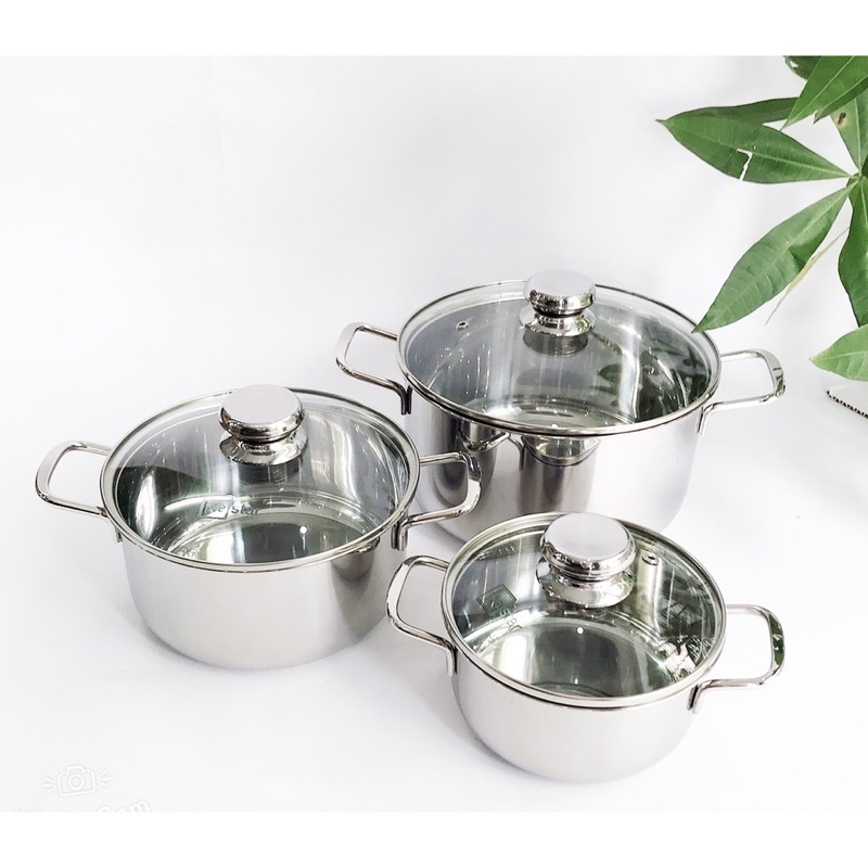 Bộ nồi gồm có 3 sản phẩm với đường kính là 16 cm, 20 cm, 24 cm, bạn có thể dùng nồi nhỏ để nấu cháo cho bé, nồi trung để kho thịt, sườn tầm 0.5 kg, nồi lớn nhất nấu canh hoặc luộc gà cỡ 1.5 kg.