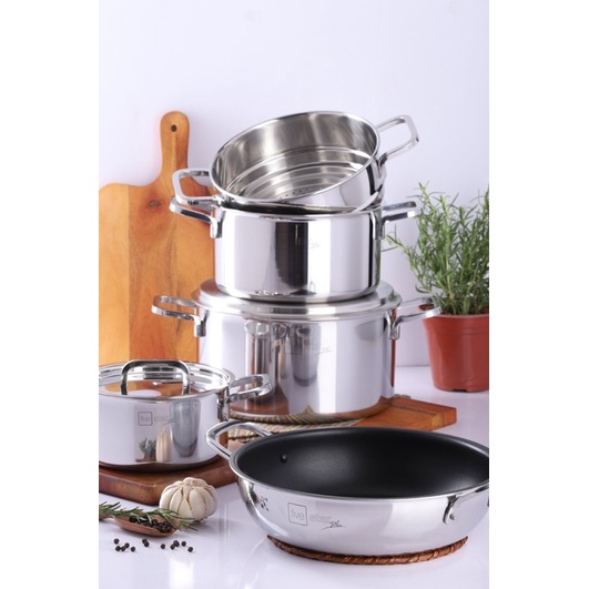 Nhà cửa & Đời sống > Dụng cụ nhà bếp > Nồi || Bộ nồi Fivestar 4 cái 3 lớp đúc liền nắp inox 304 Kèm chảo 22cm và xửng hấp 20cm.Còn hàng