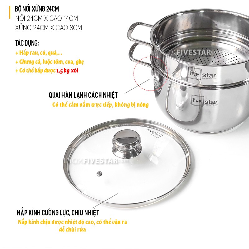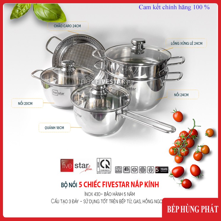 Bộ nồi 5 chiếc fivestar đường kính là 1 nồi: 24 x 14 cm; 1 nồi 20 x 10 cm và 1 nồi 18 x 10 cm; 1 chảo: 24 x 6.5 cm và 1 xửng 24 x 8 cm