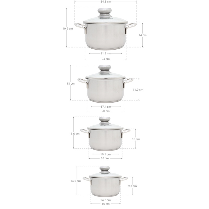 - Bộ sản phẩm gồm 4 nồi với những kích cỡ phổ biến 16cm – 18cm- 20cm – 24cm, đáp ứng nhiều mục đích sử dụng khác nhau trong gia đình .