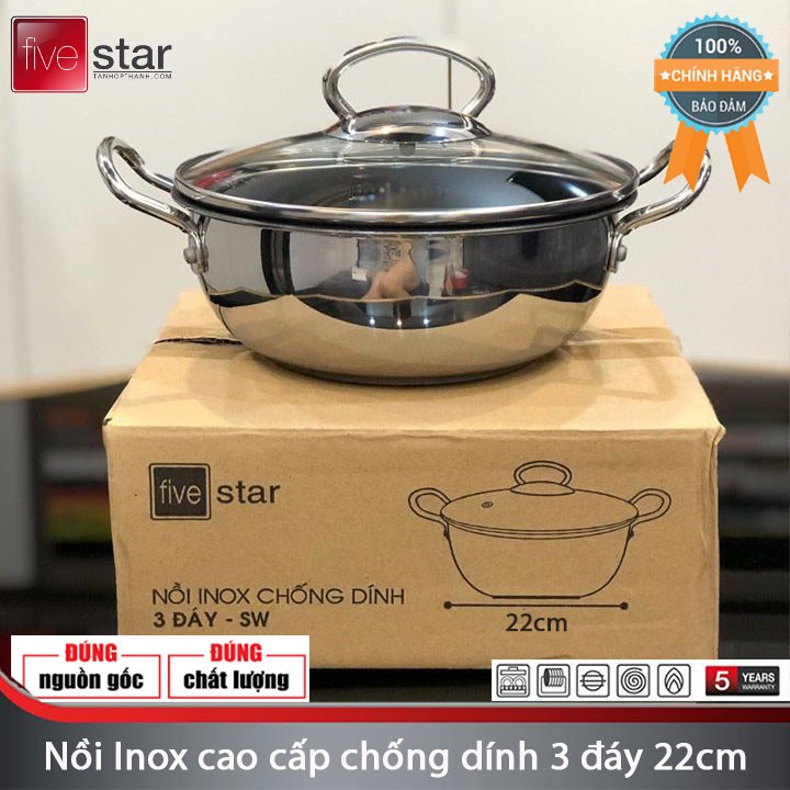 Nồi kho cá hoặc nồi Inox 3 đáy chống dính 22cm Fivestar FSN22IN005 đường kính 20cm với mặt đáy phủ lớp chống dính thiết kế có thể chiên không dầu, cho bạn nấu nướng, đặc biệt kho cá, thịt tiết kiệm dầu ăn tối ưu, tốt hơn cho sức khỏe. với lớp chống dính giúp thức ăn chín đều và dễ dàng đảo, trộn trong quá trình kho nấu mà không làm gãy nát thức ăn, giúp món ăn đặc biệt món cá kho của bạn không chỉ ngon mà còn đẹp mắt