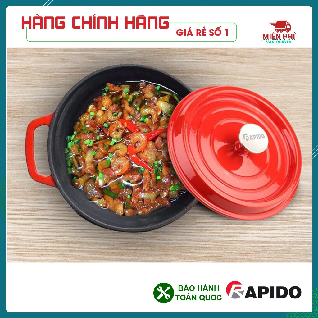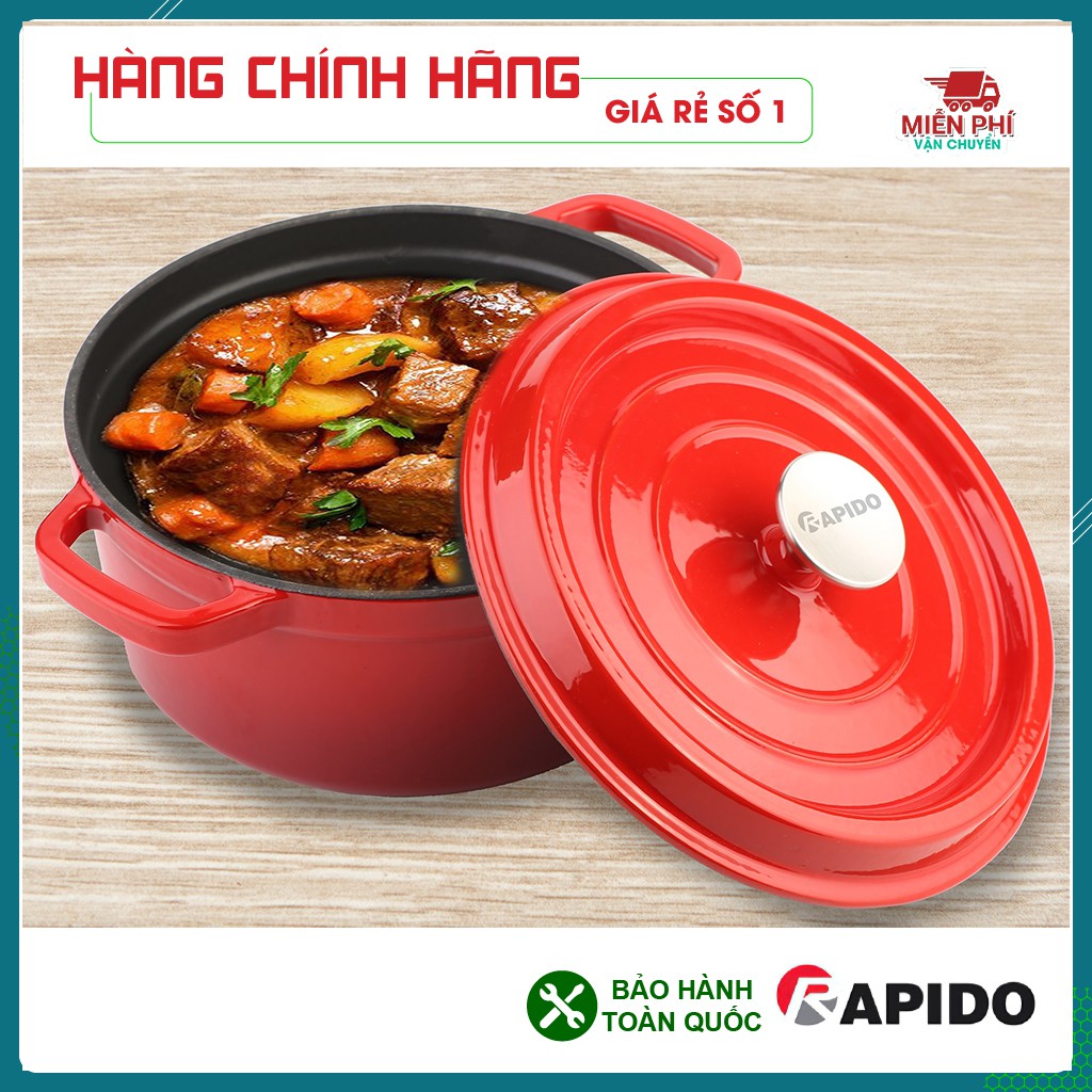 Nồi gang đúc tráng men Rapido được đúc nguyên khối với thiết kế sang trọng, màu sắc bắt mắt, tươi mới, phù hợp với nhiều loại bếp như bếp từ, bếp điện, bếp gas. Có thể chế biến các món ăn như ninh, hầm, chiên, xào,…