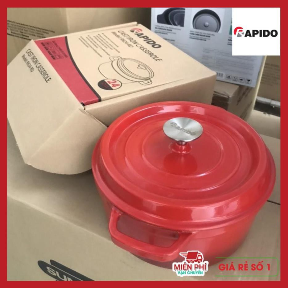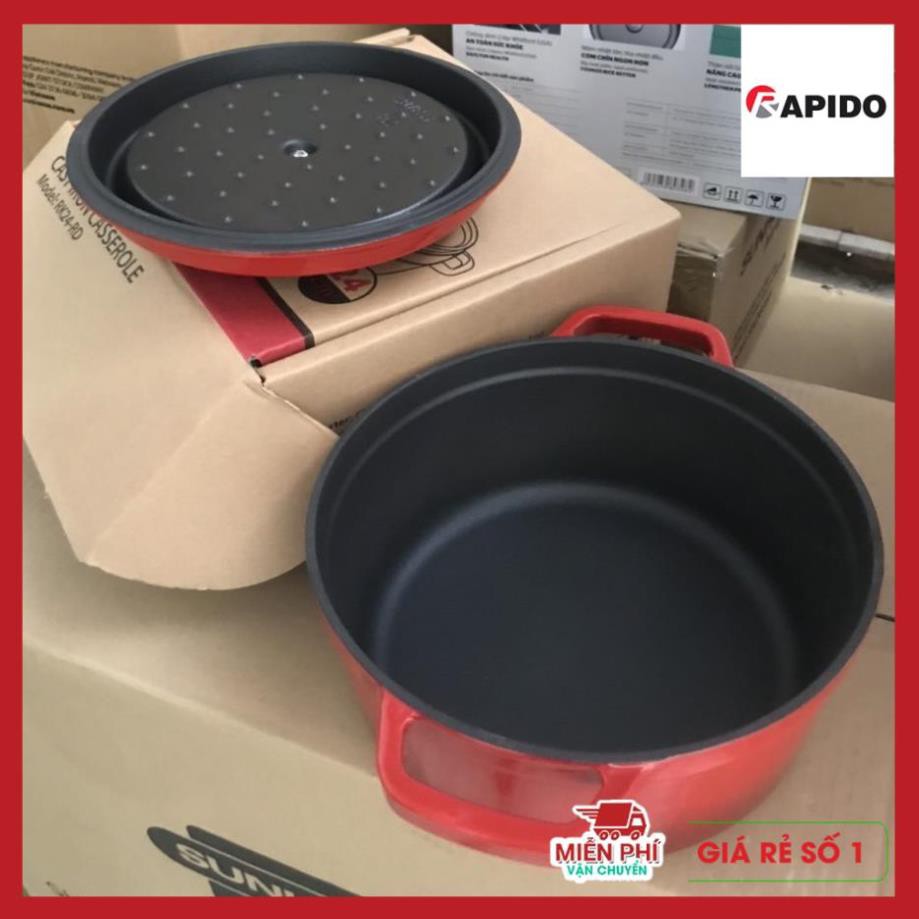 Nồi gang đúc tráng men Rapido được đúc nguyên khối với thiết kế sang trọng, màu sắc bắt mắt, tươi mới, phù hợp với nhiều loại bếp như bếp từ, bếp điện, bếp gas. Có thể chế biến các món ăn như ninh, hầm, chiên, xào,…