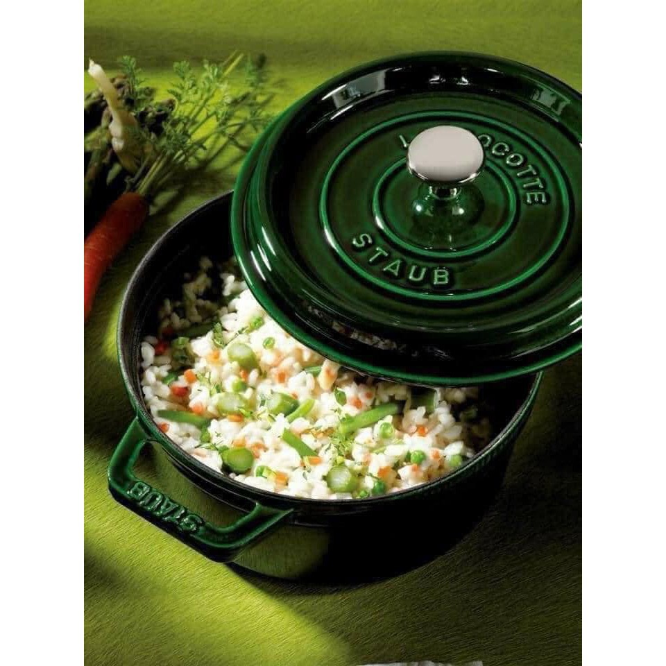Nồi gang STAUB COCOTTE Xanh Húng QuếThiết kế sang trọng, có thể đặt ngay trên bàn ăn sau khi nấu. Lớp phủ màu bên ngoài chống trầy và bền màu theo thời gian. Nắp đậy thiết kế đặc biệt giúp món ăn bên trong luôn chín đều và không bị khô. Lý tưởng để chế biến các món hầm hay đặt vào lò nướng. Có thể sử dụng trên tất cả các loại bếp, kể cả bếp điện từ.