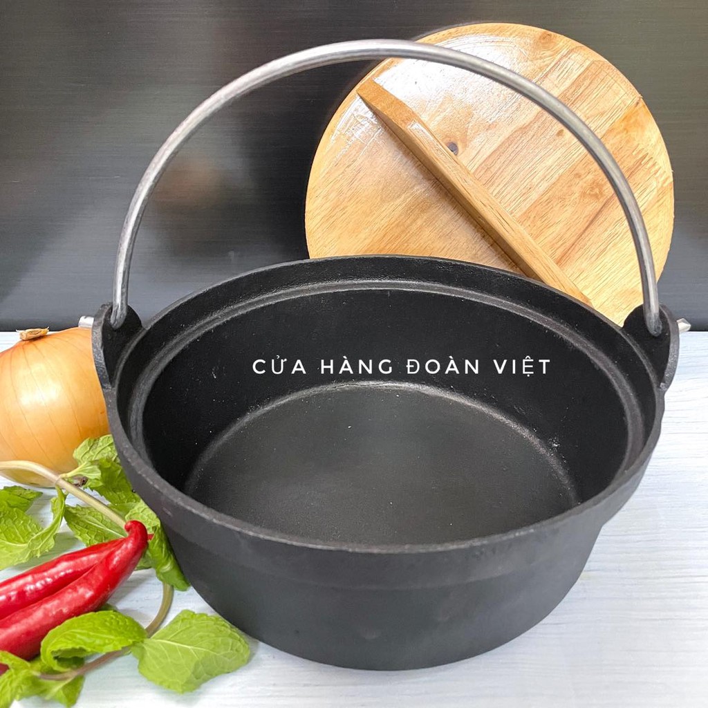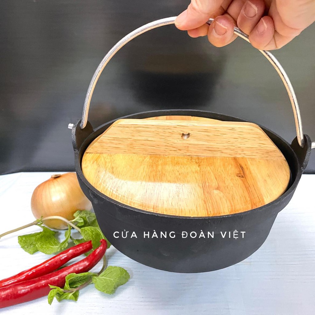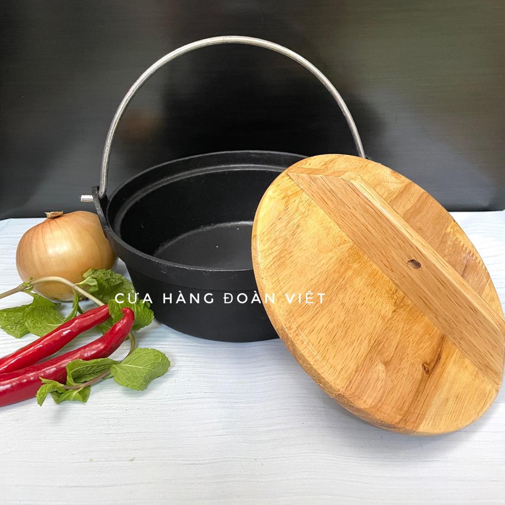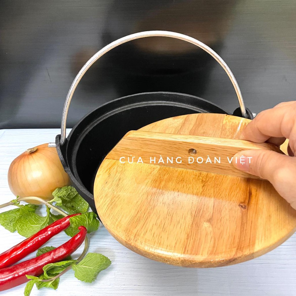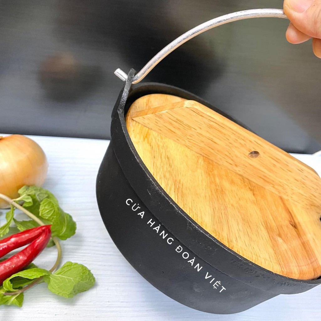 Nồi Gang, Thố Gang Nắp Gỗ Cao Cấp - Nồi Nấu Mì Cay, Cơm Chiên, Thố Lẩu, Kho Tộ - CHỐNG DÍNH NẮP GỖ nặng 1500g