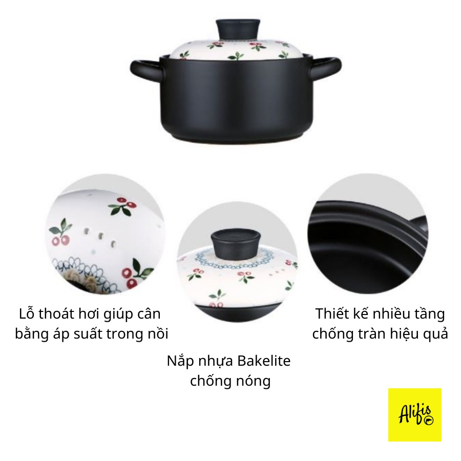 + Miệng nồi gốm được thiết kế nhiều tầng giúp chống tràn hiệu quả.