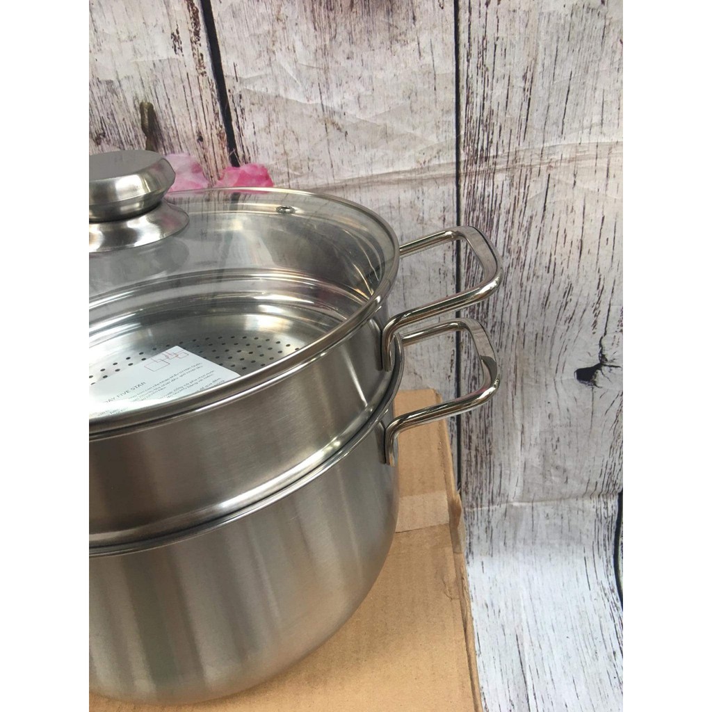 - Bộ nồi xửng bao gồm: 1 nồi đường kính 26cm, 1 xửng hấp đường kính 26cm, 1 nắp thủy tinh đường kính 26cm.