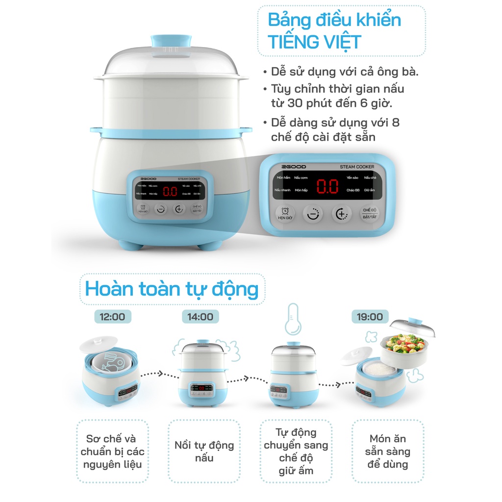 NỒI HẦM CHẬM VÀ HẤP CÁCH THỦY 2GOOD A300 Có chức năng HẸN GIỜ NẤU và BẢNG ĐIỀU KHIỂN TIẾNG VIỆT vô cùng tiện lợi và dễ sử dụng, đến NGƯỜI LỚN TUỔI cũng có thể dùng