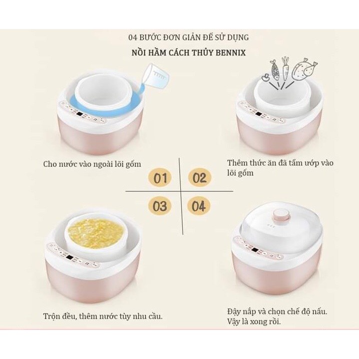 - Nồi Hầm cách thủy Bennix BN-200A, hàng cao cấp của Thái Lan sử dụng nguyên lí hầm chậm cách thủy mang lại hiệu quả tuyệt vời trong việc nấu nướng, đặc biệt là trong việc nấu cháo ăn dặm cho trẻ, chưng yến.- Cải tiến lớn nhất đến từ khay hấp Tầng Gốm cho phép nấu 2-3 món ăn trong cùng 1 lần nấu, Tiết kiệm Thời gian, Công Sức và Điện năng tiêu thụ cho Mẹ.