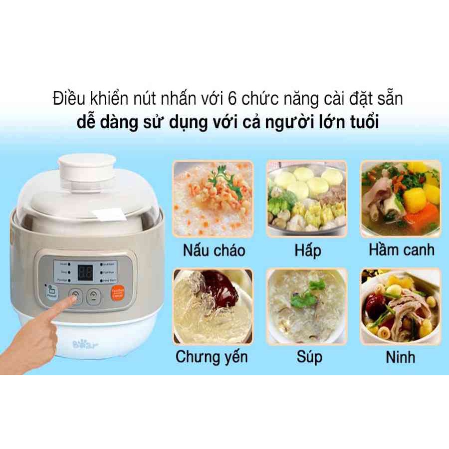 Nồi Hầm Điện Đa Năng Bear DDZ-A08D1 có các chức năng như nấu cháo, ngũ cốc, tráng miệng, hầm xương, hâm nóng, hấp cách thuỷ với các mức thời gian được lập trình sẵn. Bạn chỉ cần cho nguyên liệu vào nồi - lựa chọn chế độ nấu phù hợp với 1 nút duy nhất cực dễ dùng - đi chơi hoặc làm việc khác là đã có ngay 1 bữa canh hầm bổ dưỡng, bữa cháo dinh dưỡng cho con cái & gia đình rồi. Công nghệ sinh ra là để phục vụ chúng ta - những người phụ nữ của gia đình thời đại mới: năng động, tháo vát, thông minh. Hãy yêu thương & dành thời gian chăm sóc bản thân mình nhiều hơn với nồi hầm điện mini đa năng nhé.🔆ĐẶC ĐIỂM