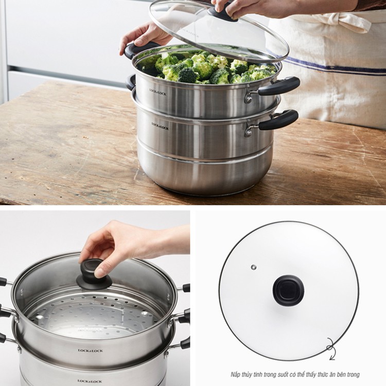 Nồi hấp 2 tầng Inox Lock&Lock size 26 28 cm Gồm 1 nồi+1 xửng hấp +1 vỉ hấp -hàng chính hãng