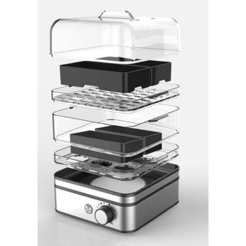 - Chế độ thời gian tự động có thể tắt khi hết nước và có thể tự động bơm nước khi đang hấp vì có khay chứa nước ngưng đọng phía dưới các khay hấp.