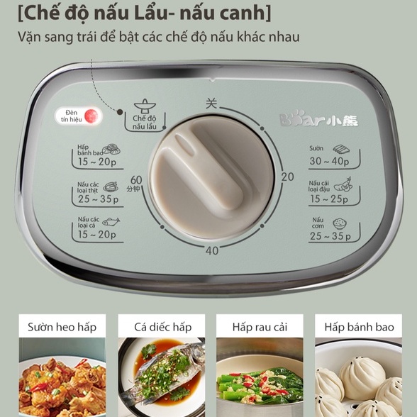 Nồi hấp và nấu lẩu điện đa năng Bear DZG-D80D2 có nhiều chế độ nấu phù hợp với nhiều món ăn khác nhau, bạn chỉ cần xoay núm hẹn giờ và làm việc khác, tất cả còn lại hãy để nồi tự thực hiện.