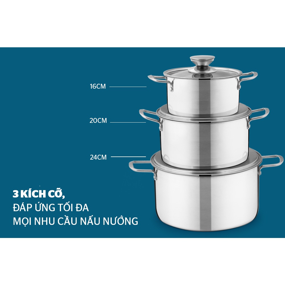 Bộ sản phẩm gồm 3 nồi với đường kính 16cm - 20cm - 24cm phù hợp với nhu cầu nấu nướng của mọi gia đình. Nồi nhỏ 16cm thích hợp để luộc trứng, kho thịt, nồi cỡ trung 20cm để nấu canh cho 2-4 người và nồi lớn 24cm có thể luộc gà, nấu canh hoặc lẩu cho 3-5 người.