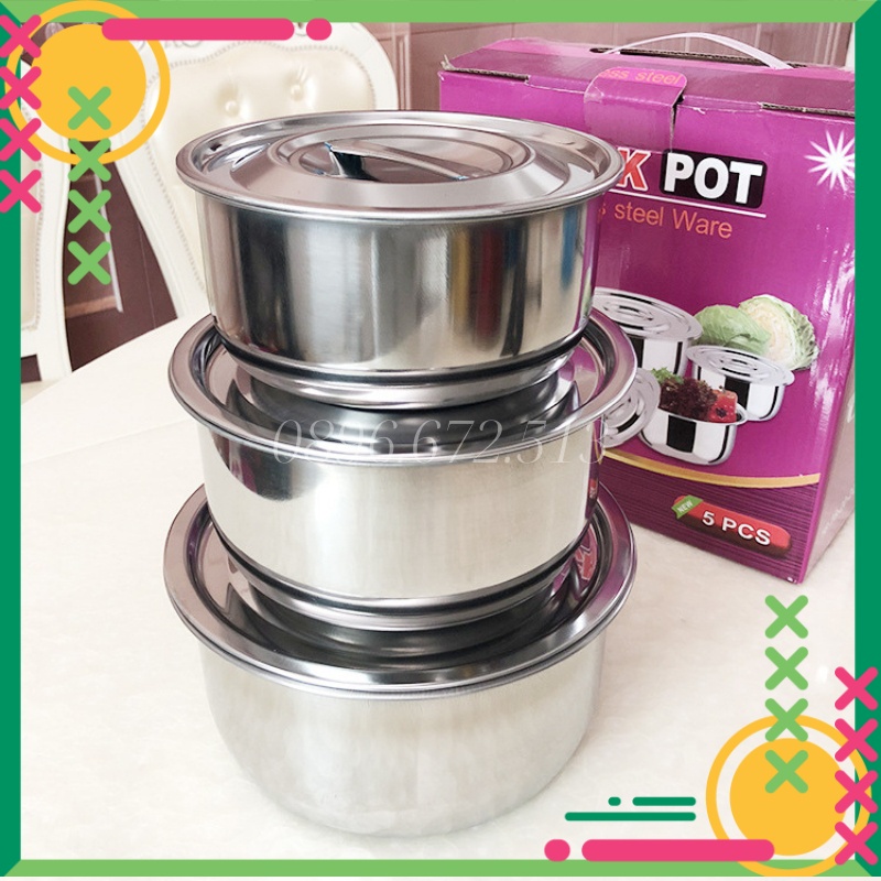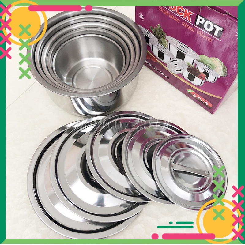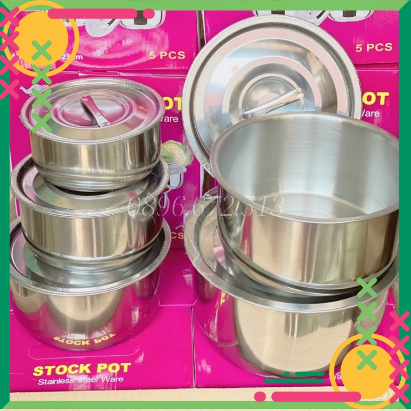 Bộ nồi inox 5 món gồm 1 nồi 16 cm, 1 nồi 18 cm, 1 nồi 20 cm, 1 nồi 22 cm, 1 nồi 24 cm