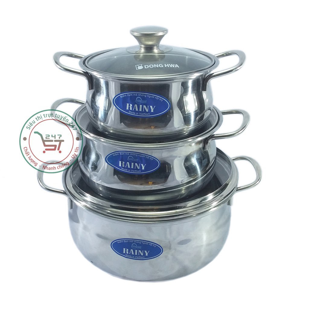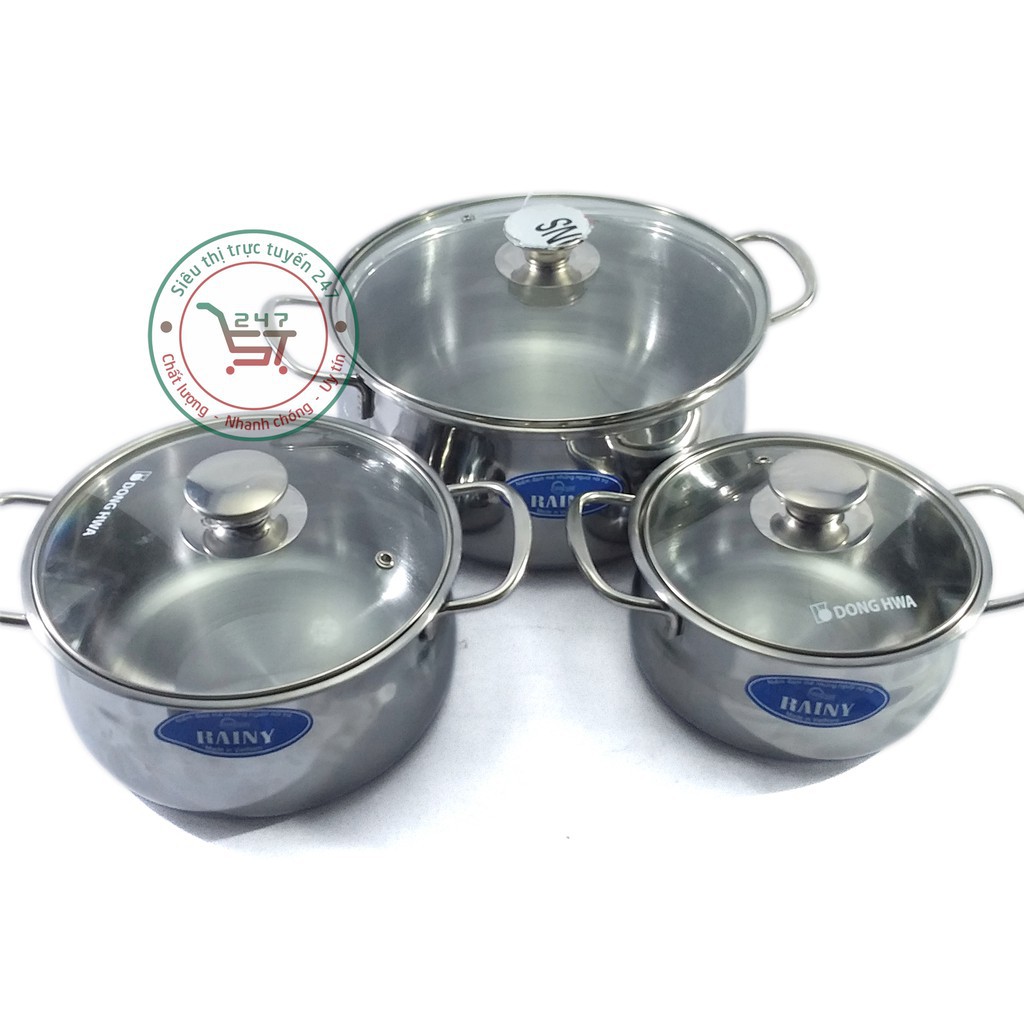 Nhà cửa & Đời sống > Dụng cụ nhà bếp > Nồi || Bộ nồi inox 3 cái thân bầu nắp thủy tinh Rainy RN06THANBAU bền đẹp sáng bóngCòn hàng
