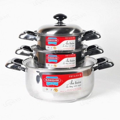 - Bộ 3 nồi inox 3 đáy Sunhouse SH333 là sản phẩm đồ dùng nhà bếp của thương hiệu Sunhouse được làm từ inox cao cấp với đáy 3 lớp rất chắc chắn, đảm bảo độ bền dài lâu đồng thời tăng hiệu quả nấu ăn cũng như giảm tiêu hao năng lượng do nồi có khả năng lưu nhiệt cao.- Bộ sản phẩm bao gồm 3 nồi với dung tích khác nhau đáp ứng nhu cầu nấu ăn của các gia đình. Bộ nồi có khả năng dẫn nhiệt vượt trội, giúp tiết kiệm thời gian cũng như giảm tải chi phí sinh hoạt gia đình.