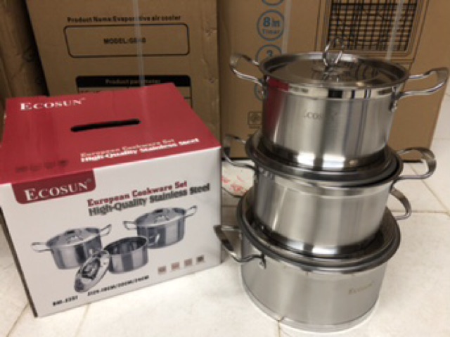 Bộ 3 nồi inox Ecosun cao cấp được làm bằng chất liệu Inox sáng bóng, Sang trọng, Bền đẹp với giá cả phù hợp với thu nhập của đại đa số người dân.