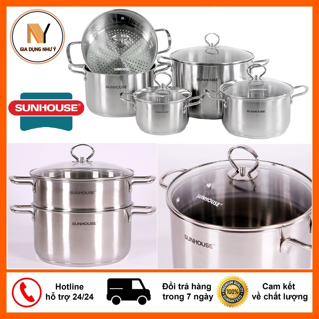 Bộ Nồi Inox 3 Đáy SUNHOUSE SH895 Cao Cấp Kèm Xửng Hấp, Sử Dụng Trên Mọi Loại Bếp