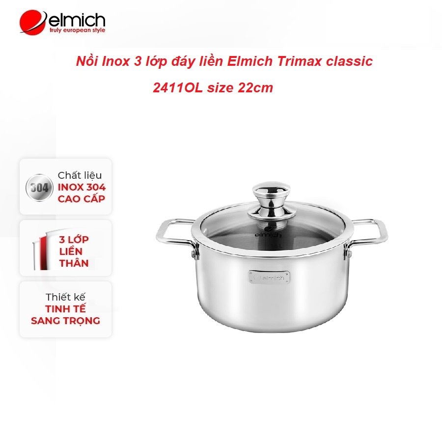 Nồi Inox 3 lớp đáy liền Elmich Trimax classic 2411OL size 22cmKích thước (Đường kính x Chiều cao): 22 x 12.5 cm