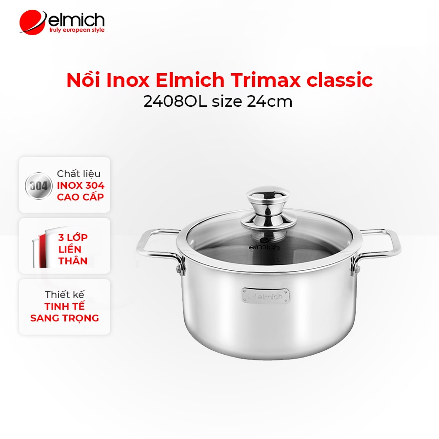 [Mã LIFECPMALL giảm 12% đơn 250K] Nồi Inox 3 lớp đáy liền Elmich Trimax classic 2408OL size 24cm