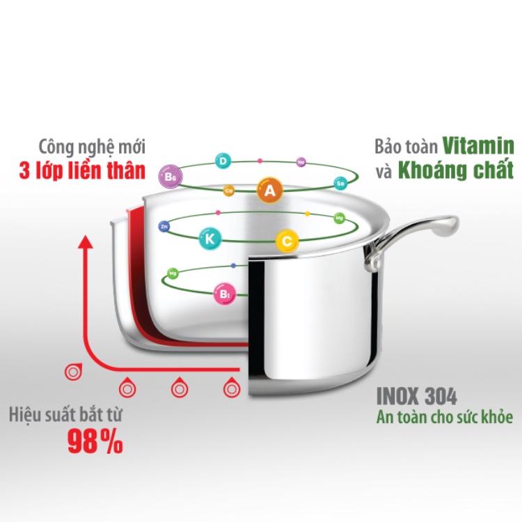Bí mật của nồi Inox 304 bếp từ Liolux LIO-505F28 nằm ở cấu tạo 3 lớp liền thân dày dặn – Sự kết hợp hoàn hảo của 3 lớp kim loại để tối ưu hiệu quả của từng loại chất liệu: