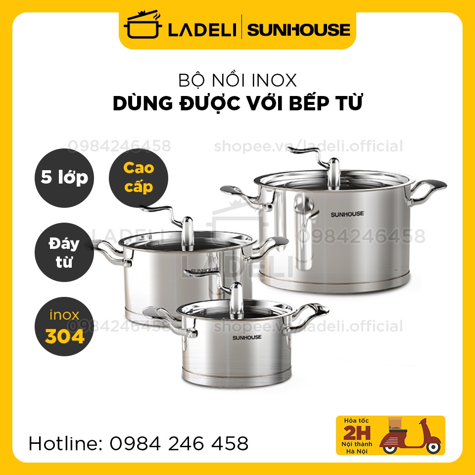 Nhà cửa & Đời sống > Dụng cụ nhà bếp > Nồi || Bộ nồi inox 304 cao cấp 5 đáy SUNHOUSE SHG2503MSA vung kính đáy từCòn hàng