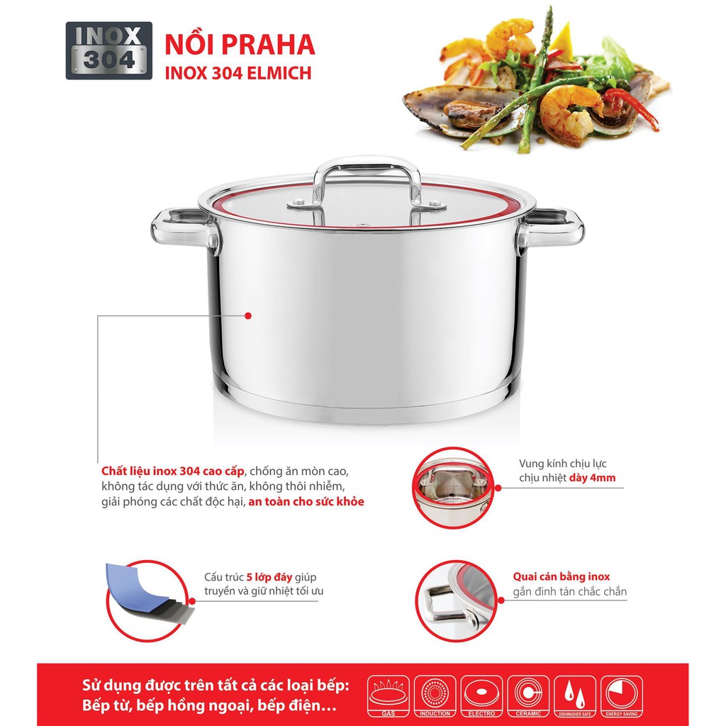 Tính năng nổi bật- Nồi Elmich Praha được làm từ Inox 304, chống ăn mòn cao, không tác dụng với thức ăn, không thôi nhiễm, giải phóng các chất độc hại, tuyệt đối an toàn cho sức khỏe
