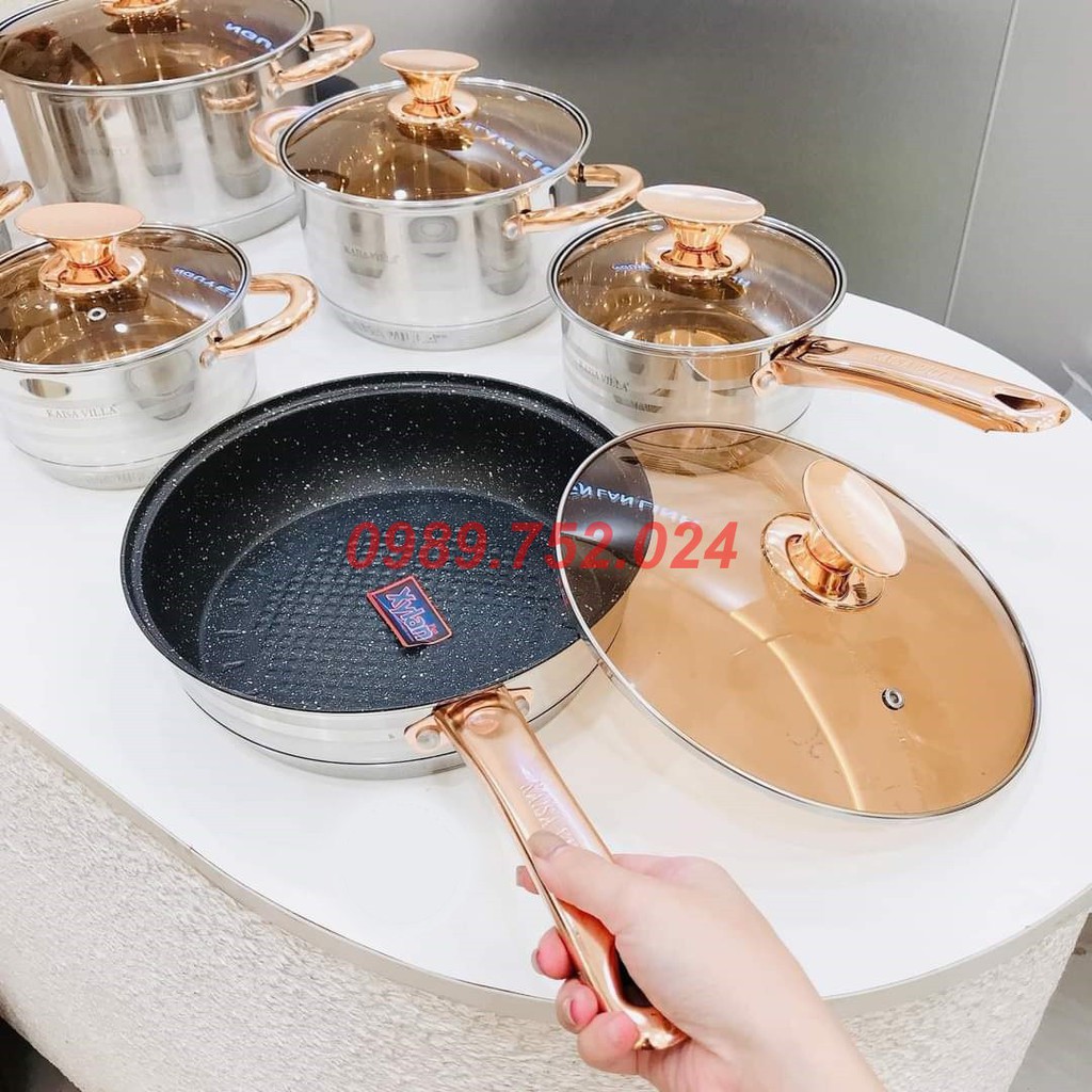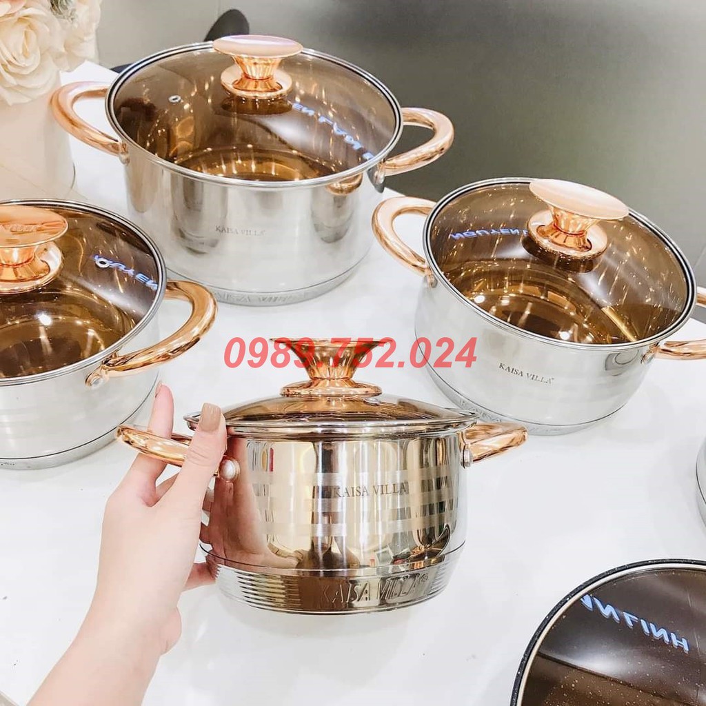 Bộ Nồi Inox 304 Kaisa Villa 6 Món 12 Chi Tiết - Bộ Nồi Inox 9 Đáy Kèm Nắp Kính Cao Cấp Dùng Cho Mọi Loại Bếp