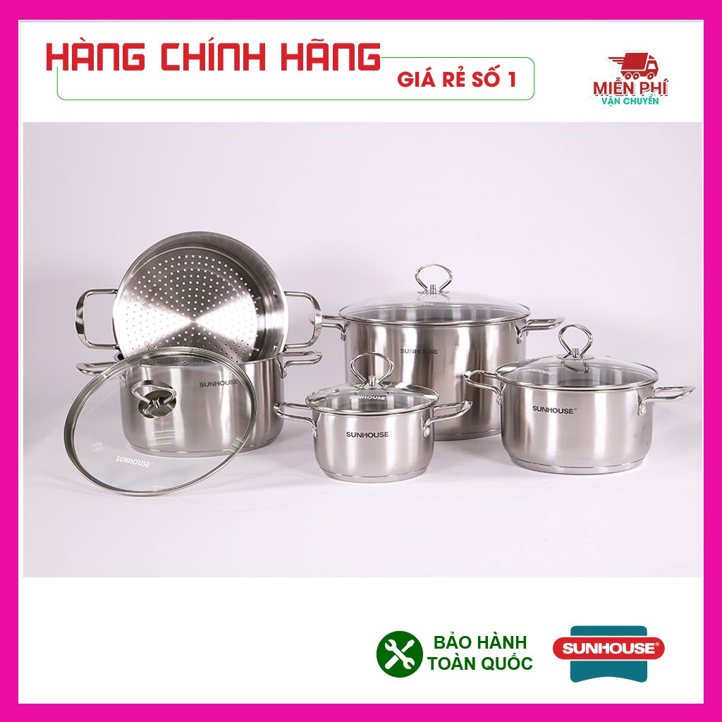 Nhà cửa & Đời sống > Dụng cụ nhà bếp > Nồi || Bộ nồi inox 4 nồi + xửng hấp 3 đáy Sunhouse SH895, bộ nồi Sunhouse dùng cho bếp từ, siêu to khổng lồCòn hàng