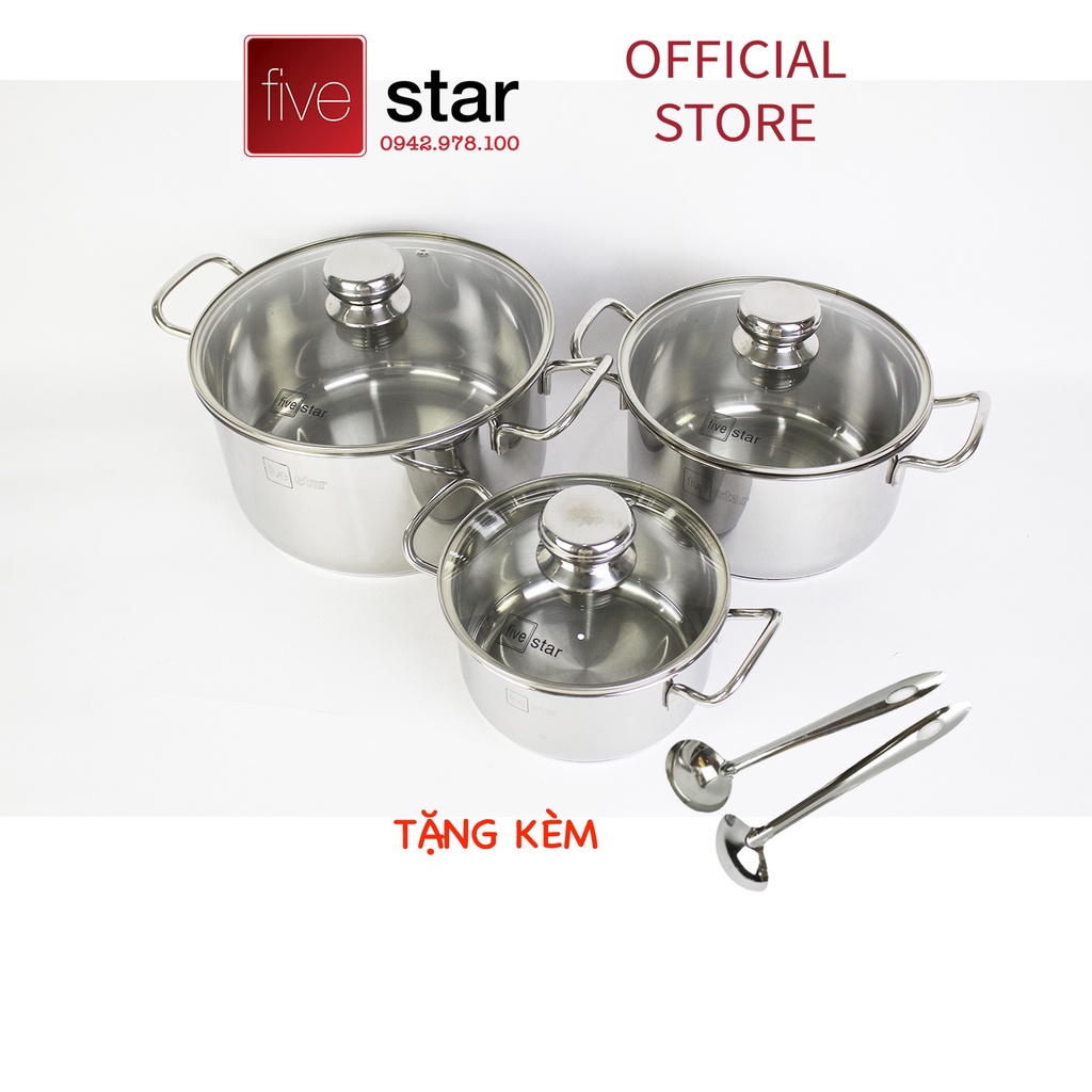 Bộ nồi inox 430 Fivestar Standard 3 đáy bếp từ nắp kính FS06CG tặng 2 muỗng canh( 1 nồi 16cm x 1 nồi 20cm x 1 nồi 24cm )